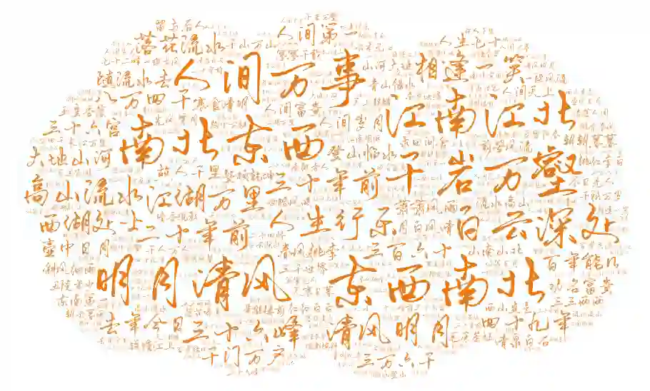 在四字高频词中,空间方位的词汇较多,如“南北东西”、“江南江北”、“东西南北”等词。因四字词词长较长,像“人间万事”、“千岩万壑”、“明月清风”、“白云深处”、“相逢一笑”等词就拥有较高的信息量,能够还原大部分的诗歌意境了。