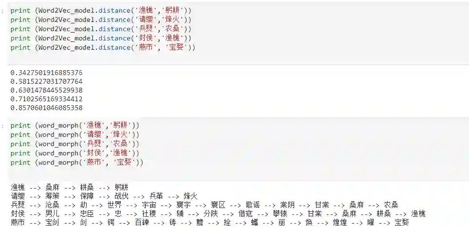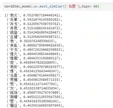 结果大都是跟“战争”&“创伤”相关的词汇,语义关联关系捕获能力较强,后续的热门诗歌体裁挖掘任务也会用到词嵌入模型的这个特性。
