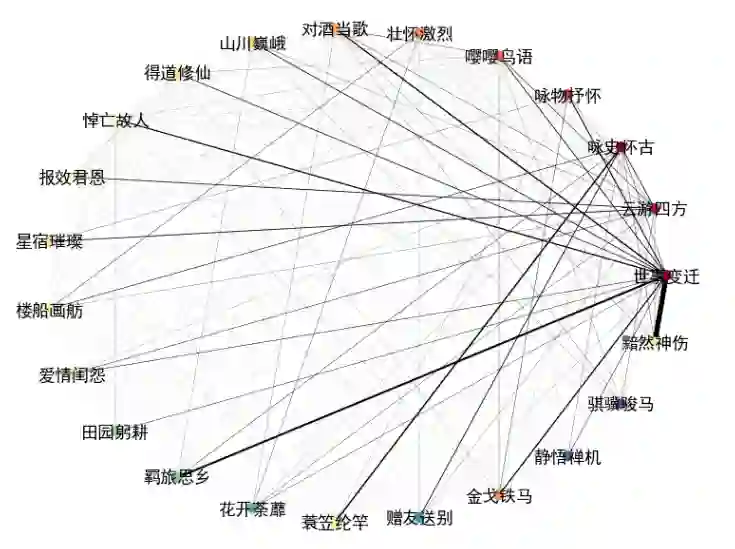 前面的诗歌题材分类是多标签分类,也就是可能会出现同一首诗歌对应多个题材标签的情况。在这种情况下,我们可以进行题材标签的共现分析,也就是多次同时出现的题材标签,它们之间会存在一定的关联性。