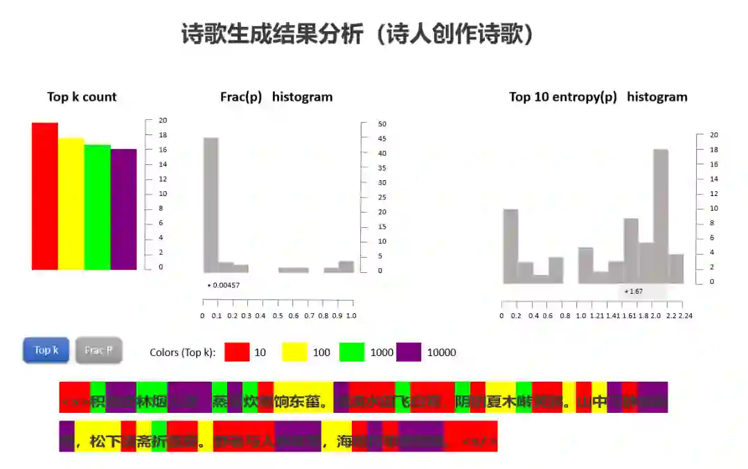 从结果中,我们可以看到机器作诗时,红色和黄色的字概率分布区间占比较大,逐字生成时一般是从头部的字概率分布中来取,从而导致会诗句生成较为常见的表达;人创作诗歌时,各颜色代表的字概率分布区间占比较为接近,至少是差异不大,最终导致诗歌的表达千变万化,不落俗套。