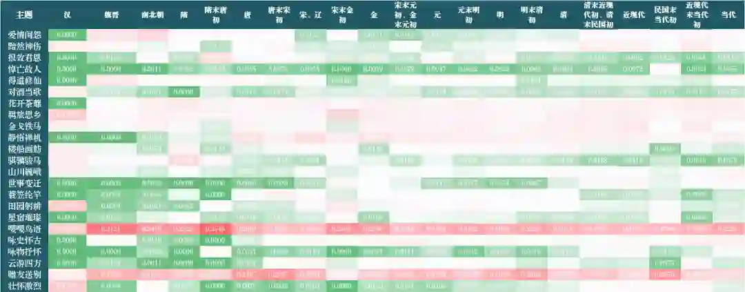 在这一环节中,笔者的在于根据一些诗歌领域知识,找到上述运行结果中热门题材及其下辖的题材专属性词汇。其中,“题材专属性词汇”的内涵主要有以下两点: