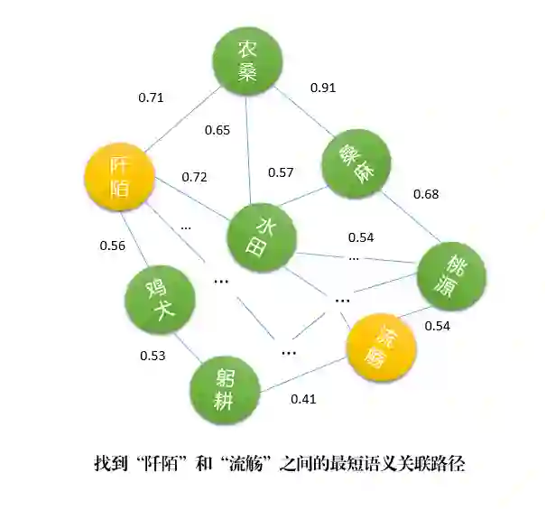 回到词汇相关度度量的问题上来,如果我们能在上述训练得到的词嵌入空间中找到两个词汇之间的最短“语义演变”线路,我们就能直观的呈现出这2个词汇之间产生语义关联的“前因后果”。