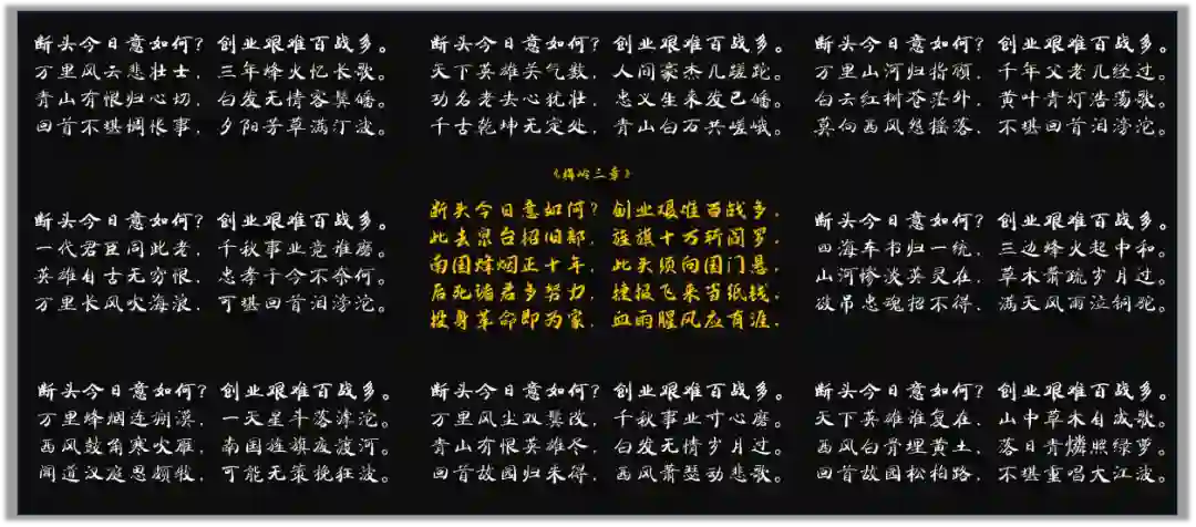 上面两张图中占据中间C位的是原诗歌,其余的诗歌由毛主席和陈老总诗歌的首联“引导”而成,基本含有“金戈铁马”相关的意象,题材贴合度较高,大都跟征战、戌边、杀敌保国有关,比如: