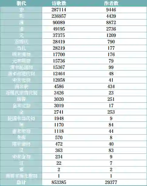 经过数据清洗后,最终得诗504,443,占到原数据库的59.1%。以下分别是清洗后的诗歌数据统计结果和部分样例: