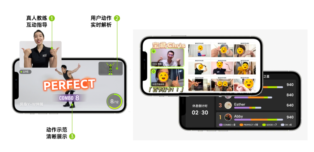 BodyPark于2021年秋季上线了其首款To C付费产品—— BodyPark“AI+真人”在线私教课。消费者无需购买特殊硬件,仅用手机可上课、并兼容iPad和智能电视投屏。区别于常规的单向直播,BodyPark的认证教练可远程观察学员的动作并进行指导,学员也能与教练提问双向互动;屏幕内嵌结构化的课件,动作示范清晰;AI识别纠错技术与游戏化即时反馈机制,既能够给学员提供趣味性坚持的动力,又能够辅助教练提高授课质量和效率;同时,社交排行榜的产品设计和强社群运营,也为用户提供了有温度的陪伴和情感鼓励。