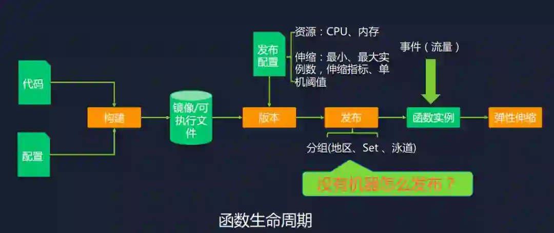 函数在编写后需经过构建、打版本、发布、弹性伸缩这四步,构建即将代码及配置构建为镜像或可执行文件;打版本即通过镜像或可执行文件,根据发布配置,生成可发布的固定版本;发布后函数实例会接受流量,驱动弹性伸缩。