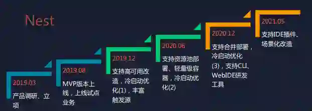公司内部 Serverless 产品为 Nest,这个项目是 19 年初开始立项,主要经过了三个阶段演进:第一,快速落地,上线试点;第二,优化技术,提升稳定性;第三,完善生态,提升效能。具体里程碑如下图所示: