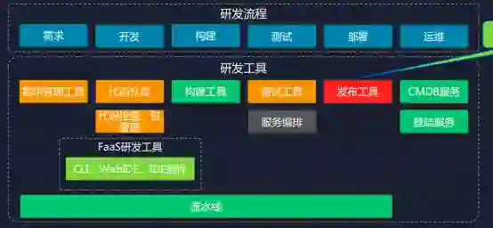传统的研发流程包括需求、开发、构建、测试、部署、运维等环节,每个环节均有体系配套工具支撑。加入 Serverless 后,在发布环节会产生分支,导致研发流程割裂。
