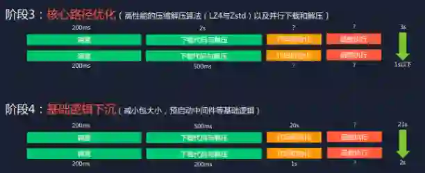第三阶段,针对下载代码实现了核心路径优化,将原解压算法换成高性能的压缩解压算法(LZ4 与 Zstd),同时采用并行下载和解压策略,实现了耗时降至 1s 以下(不包含业务函数自身启动时间)。