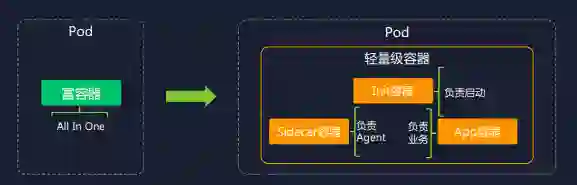 Nest 将富容器演进成了轻量级容器,将 Agent 进程隔离到 Sidecar 容器中,业务进程隔离到 App 容器中,双方互不干扰,降低了资源竞争程度。