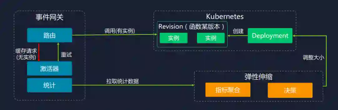 其中,管理平台负责服务和函数的管理监控、构建与发布函数、函数配置。事件网关负责承接事件源流量,然后路由到具体函数实例。函数实例内部则主要是执行函数,它包含 Runtime 和函数两部分。弹性伸缩负责根据流量进行函数实例的扩缩容。控制器负责 Kubernetes CRD(Custom Resource Definition)处理。