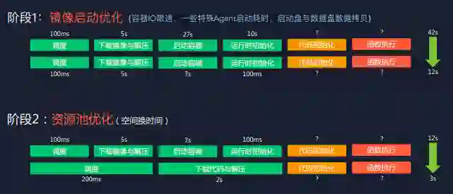 第一阶段,优化镜像启动。镜像启动相关原因包括容器 IO 限速、⼀些特殊 Agent 进程启动耗时、启动盘与数据盘数据拷贝等,排除后耗时从 42s 降至 12s(不包含业务函数自身启动时间)。