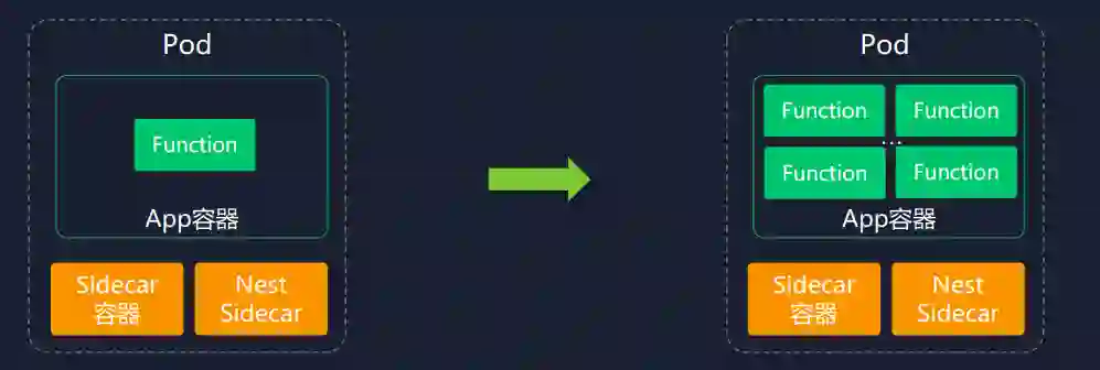 针对这个问题,Nest 采取了合并部署策略,从一个 Pod 中部署一个函数演进到一个 Pod 中部署多个函数,整体架构如下所示: