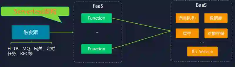 Serverless 在产品形态上分为 3 种:FaaS(Function as a Service)、BaaS(Backend as a Service)和面向应用的 Serverless 服务。FaaS 即函数服务,如 AWS 的 Lambda,BaaS 即云上 PaaS 组件,如 DB、消息队列等;近几年新提出来的面向应用的 Serverless 服务,即阿里云的 SAE(Serverless 应用引擎)、谷歌开源的 Knative 等。