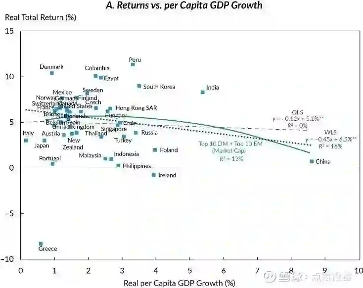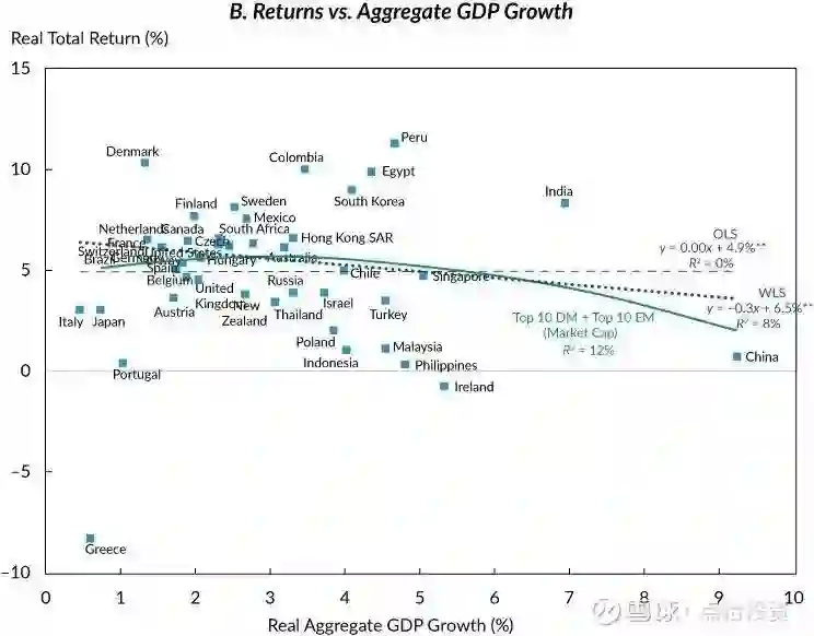 我们理解了股票市场回报率主要和企业分红率相关。随着经济的增长,企业盈利也会更加快速增长,他们赚了更多的钱就会分给股东。有了这样一个大致的思维框架,我们就来看看全球各国的股票回报率和其经济增长的相关性。