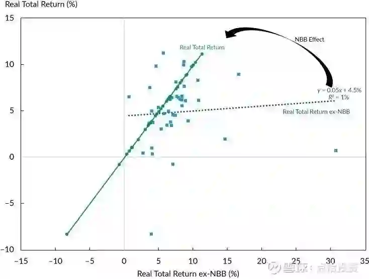 所以这就回到了股票市场的“初心”,下面这张图用了NetBuyBack(净回购)和股票市场回报率的关系。我们看到,两者相关度就非常高。如果把净回购剔除,相关性就大幅减少。而我们的A股市场,净回购一直是负的。公司从资本市场融资的金额,远高于股票分红以及回购。