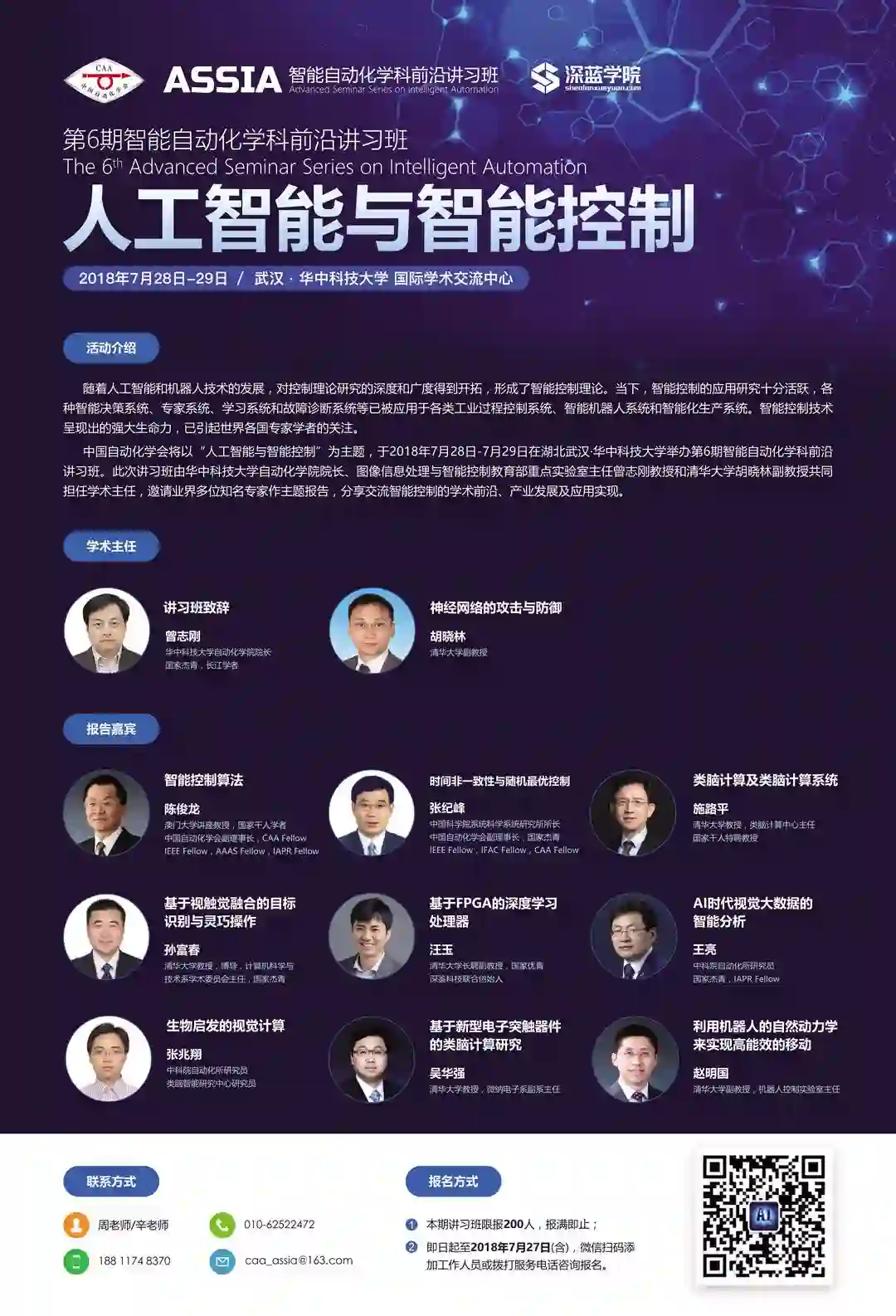 中国自动化学会将围绕“人工智能与智能控制”这一主题,于2018年07月28日-07月29日在武汉·华中科技大学举办第六期“ASSIA智能自动化学科前沿讲习班”。此次讲习班由华中科技大学自动化学院院长、图像信息处理与智能控制教育部重点实验室主任曾志刚教授和清华大学胡晓林副教授共同担任学术主任,邀请业界多位知名专家作主题报告,分享交流智能控制的学术前沿、产业发展及应用实现。