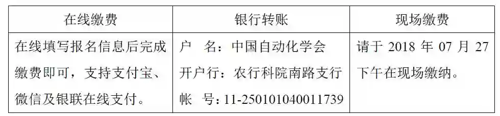 ①2018年07月26日(含)前注册并缴费:自动化学会会员2000 元/人,非会员报名同时入会2500元/人 ②现场缴费:会员2500元/人,非会员3000元/人(包含提前报名现场缴费、现场报名现场缴费);③在校生参会可享受学生优惠价格1200元/人;④公务卡缴费可现场刷卡,但需要提前提交报名信息方可按优惠价格缴费;⑤自动化学会团体会员参加,按会员标准缴费;⑥同一单位3人及以上团体报名,按会员标准缴费。