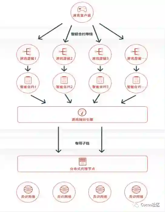 游戏规则引擎直接与链结构交互,是极为重要的核心模块。智能合约代码本质上是为了对游戏上层业务逻辑进行支持。