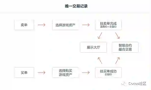 玩家从游戏内提交游戏资产到拍卖行的过程中,所对应的游戏资产在游戏中处于被锁定状态,发起者的交易内容和主链ID被绑定到卖单,当买⽅确认购买时自动完成交易过程。拍卖行使用主链Token进行交易,交易发起方需要燃烧主链的Token。交易双方的两个交易动作被打包成一笔交易,正常完成后产生唯一链上的交易记录。通过此方式可以利用主链智能合约撮合交易并增加交易双方的互信程度。
