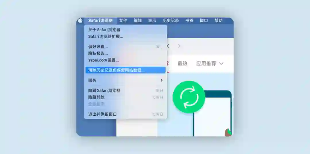 作为 macOS 上自带的浏览器,Option 可以让 Safari 提供更多的选项。比如可以让 Safari 「清除历史记录但保留网页数据」。
