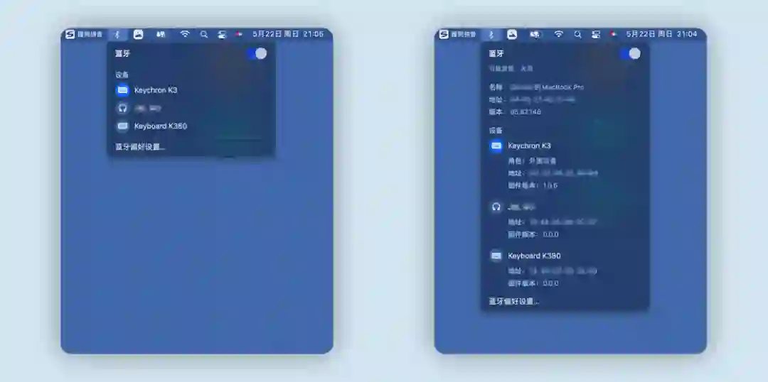 右键蓝牙显示信息对比,左侧为未按 Option 键,右侧为按 Option 键
