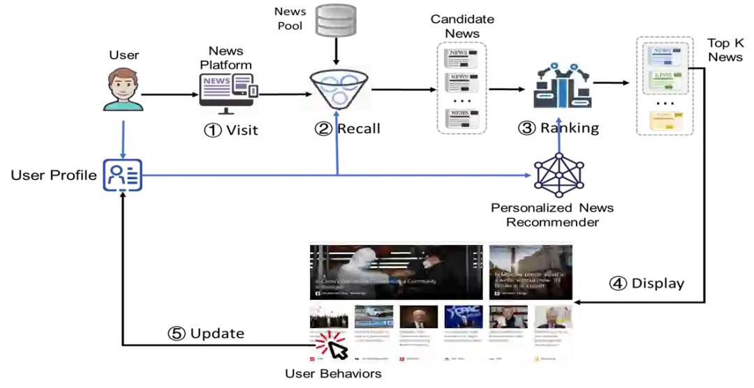 由于每天都有大量新闻产生和发布,用户难以在有限的时间内从大量新闻中找到自己感兴趣的内容,面临严重的新闻信息过载。个性化新闻推荐可以根据用户的个人兴趣对候选新闻进行排序和展示,是提升用户在线新闻阅读体验的一项重要技术。目前,新闻推荐已广泛用于 Microsoft News 等诸多在线新闻平台中。