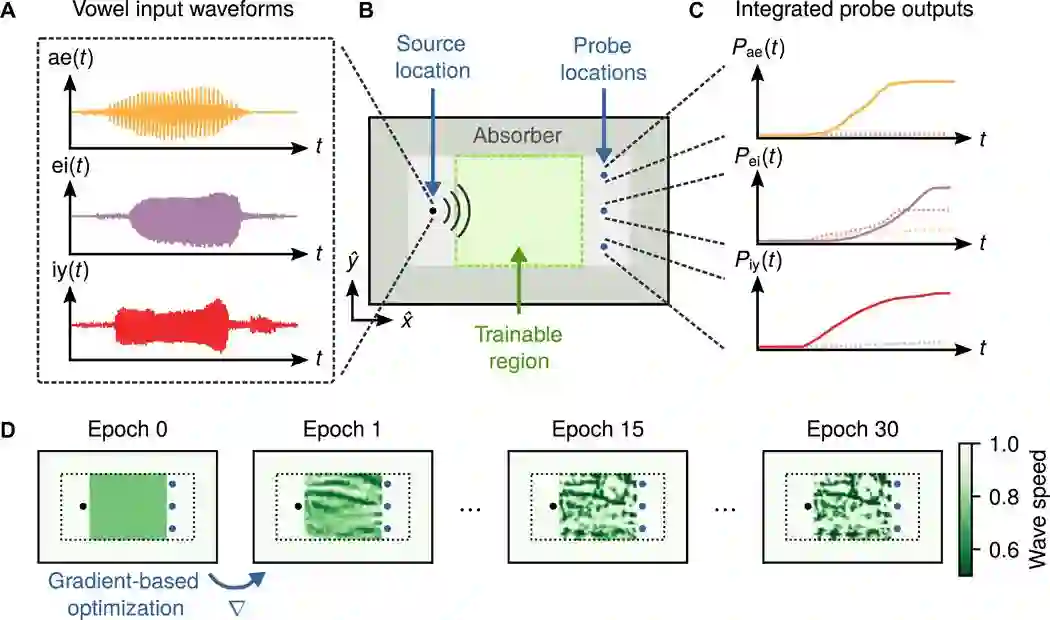 他们最近发表在《Science Advances》上的论文,证明了波的物理特性可被直接映射到循环神经网络的时序变化。利用这种联系,作者们通过 PyTorch 开发了一个数值模型,该模型证明我们可以训练一个声学/光学系统,并利用它从人类说话者录音中准确地识别出元音。本质上,作者们将元音元音波形引入物理模型,并允许优化器在域内的 1000 个点上添加和删除材料,这个操作实际上可以当做模型的权重。