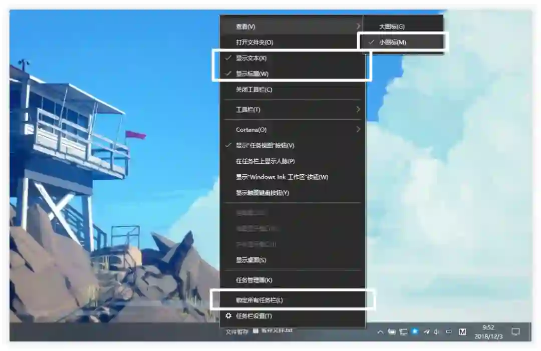 接着我们对这个工具栏做一些调整,让它更像一个暂存文件的地方。「鼠标右键 → 取消勾选锁定所有任务栏」,「鼠标右键 → 查看 → 小图标」,并取消显示标题、取消显示文本。