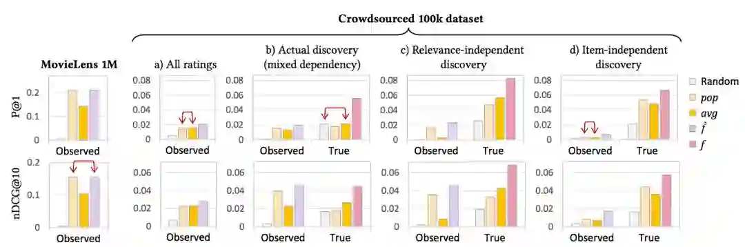 在其它研究结果中,Rocio Cañamares 等研究者证明并展示了一种定性的矛盾,即在一般离线实验设置所测量的准确率与在无偏观察下估计的真实准确率之间的矛盾。研究者们确定了确保流行度可成为推荐中安全元素的条件,并且他们还描述并说明了这样一种相反情况,即流行度可能完全是一种误导的方向,它会指向比随机推荐更差的效用。研究者们进一步发现平均评分可能比评分的数量更加有效,它作为很多情况下的推荐的趋势,而这与有偏度量值所建议的正好相反。最后,研究者展示了他们的研究成果在个性化协同过滤算法中的意义。