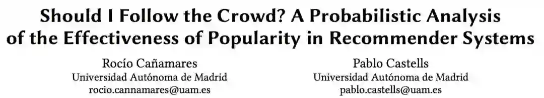 ACM 国际信息检索研究与发展会议 SIGIR 2018 近日于美国密歇根州 Ann Arbor 举行。昨日,大会公布了最佳论文等奖项,来自马德里自治大学(Universidad Autónoma de Madrid)的学者 Rocio Cañamares 和 Pablo Castells 的论文《Should I Follow the Crowd? A Probabilistic Analysis of the Effectiveness of Popularity in Recommender Systems》获得了最佳论文奖,微软与马萨诸塞大学阿姆赫斯特分校合作论文《Cross-Domain Regularization for Neural Ranking Models Using Adversarial Learning》获得最佳短论文奖。本文将对最佳论文进行简要介绍。