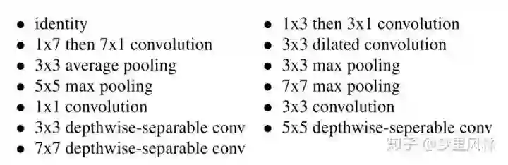 搜索空间:把搜索空间表示成有向图,节点是feature map,边是运算,边有类型和方向两个属性,方向决定了要连接哪些节点,类型决定了要做哪种运算。