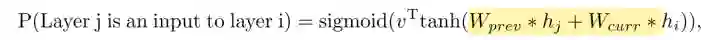 为了在layer之间增加skip connection,这篇论文还另外为第N层输出一个N-1的向量,这个向量的值代表是否要将前一层连进来作为input;连接prev层的概率如下计算: