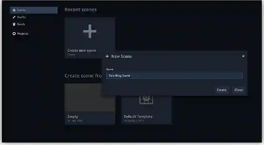 在 Sumerian仪表板中,只需按下按钮即可轻松创建一个新场景。