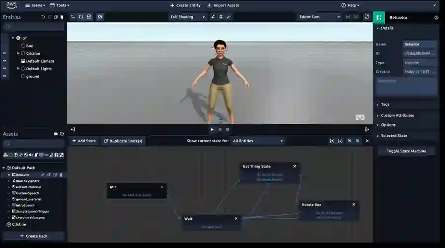 下面我们通过一个简单的例子来实现一个简易版VR应用,创建具有 Sumerian资产库、状态机动画并支持虚拟现实(VR)的场景。然后导入到Amazon Amplify创建的应用中实现闭环。
