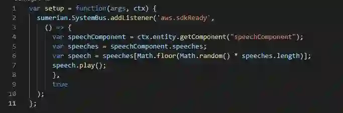 此脚本会等待AWS开发工具包加载并检索凭证。然后,它会获取对同一实体 (Host)上的语音组件的引用,并获取所有附加的语音列表。它从数组中选择语音并进行播放。