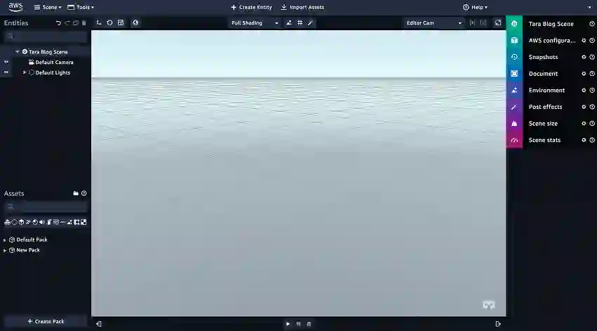 新场景的默认视图会打开并显示在Sumerian编辑器中。在编辑器中打开刚创建的场景后,就可以将assets轻松导入我的场景中。