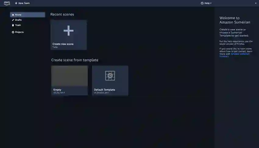 由于 Amazon Sumerian不要求具有3D图形制作或编程经验即可构建丰富的交互式VR和AR场景,因此让我们来快速使用Sumerian仪表板创建项目。