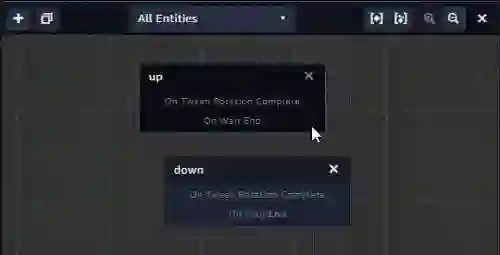 8、在状态机面板中,每个状态显示了两个事件,一个事件在动画结束时发生,另一个事件在等待操作结束时发生。单击等待结束事件up,然后将一条线拖动到沿向下状态。然后反方向执行相同的操作