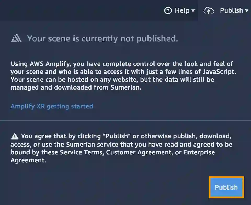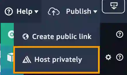 单击Sumerian控制台右上角的发布下拉菜单,然后单击私下托管: