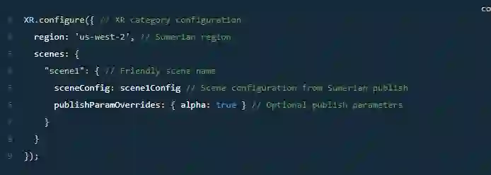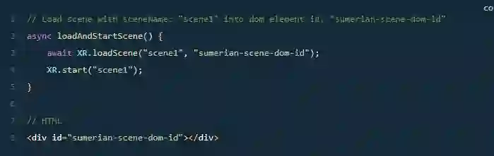 XR 类别允许使用方法将 Sumerian场景渲染为DIVHTML元素loadScene。加载场景后,XR.stARt()方法将启动场景。要渲染场景,请在方法调用中传递场景名称和元素的id: