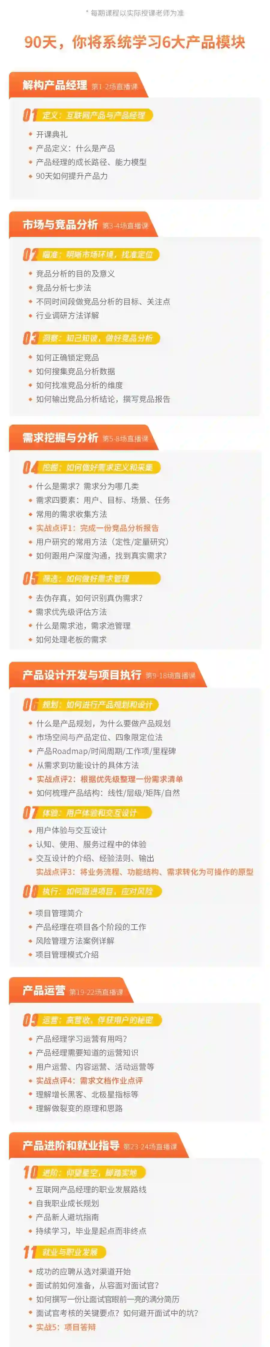 课程以6个产品知识核心作为主体,它们分别是:解构产品经理、行业与竞品分析、需求挖掘与分析、设计开发与项目执行、产品运营、产品进阶与就业指导。