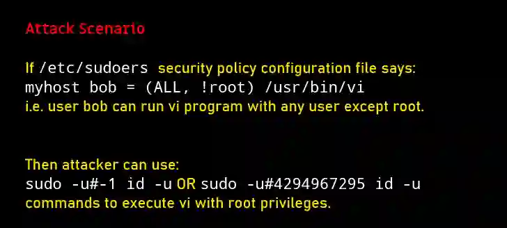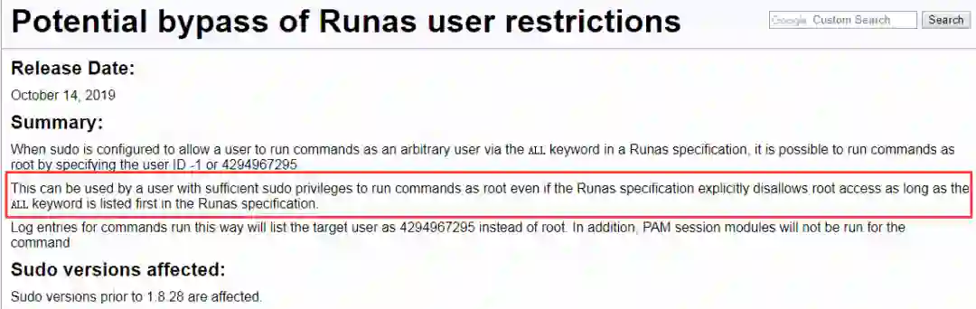 先简单说明一下情况,报道指出 sudo 存在一个安全策略隐患,即便"sudoers configuration"配置文件中明确表明不允许以 root 用户进行访问,但通过该漏洞,恶意用户或程序仍可在目标 Linux 系统上以 root 用户身份执行任意命令。