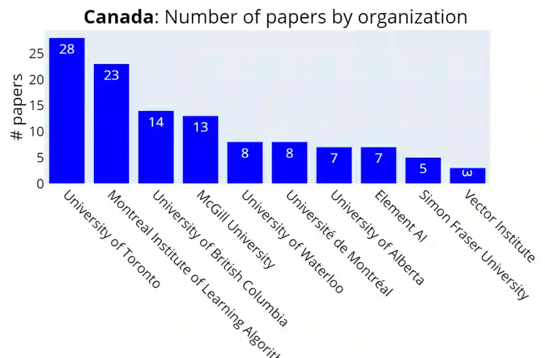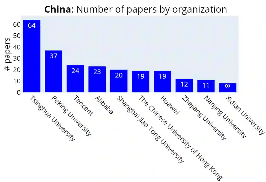 在前十名中,有三个美国以外的机构:第一个是清华大学(排名第7位),其次是DeepMind(排名第9位)和牛津大学(排名第10位)。
