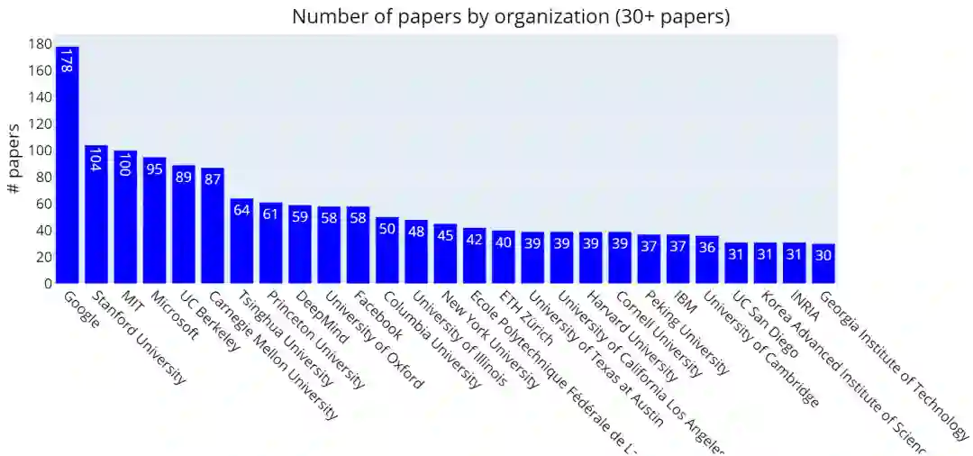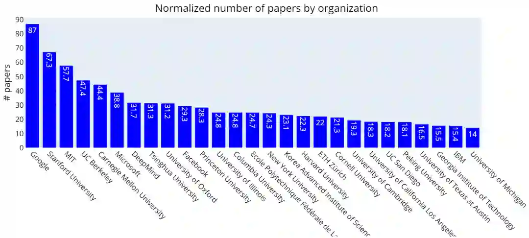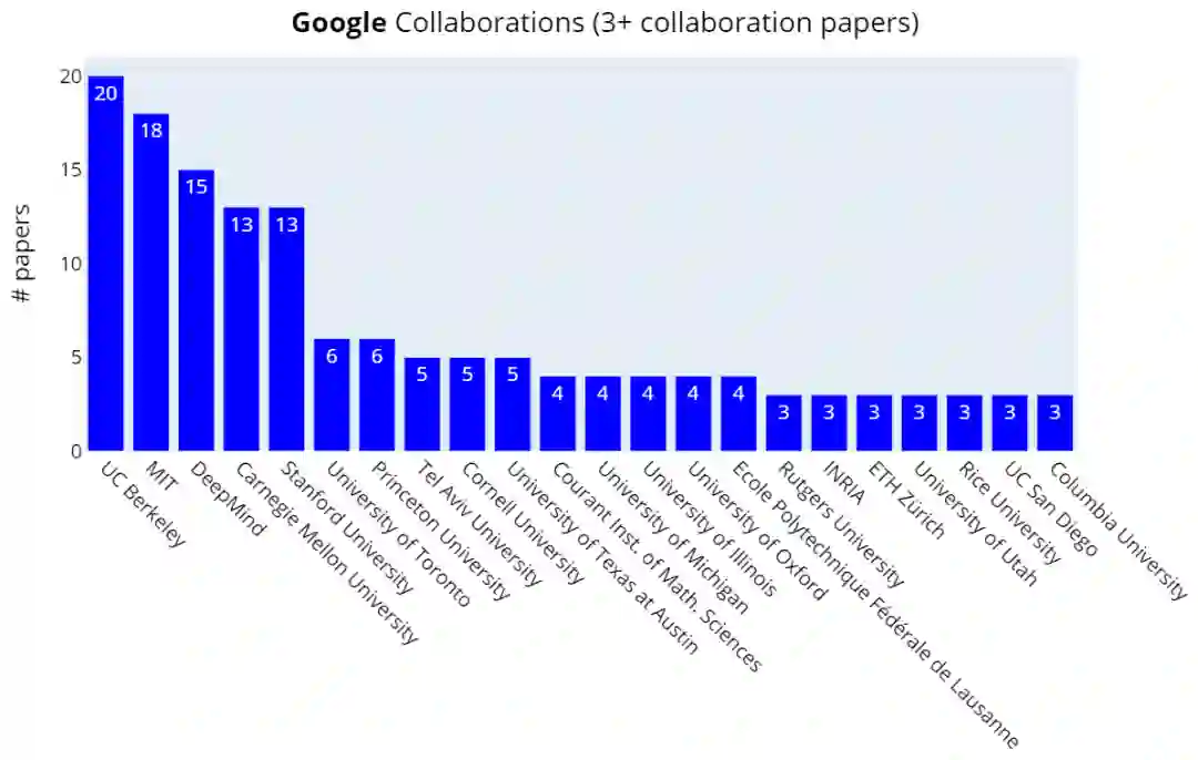 类似于ICML 2020,谷歌、斯坦福大学和麻省理工学院的论文接受数量保持领先。