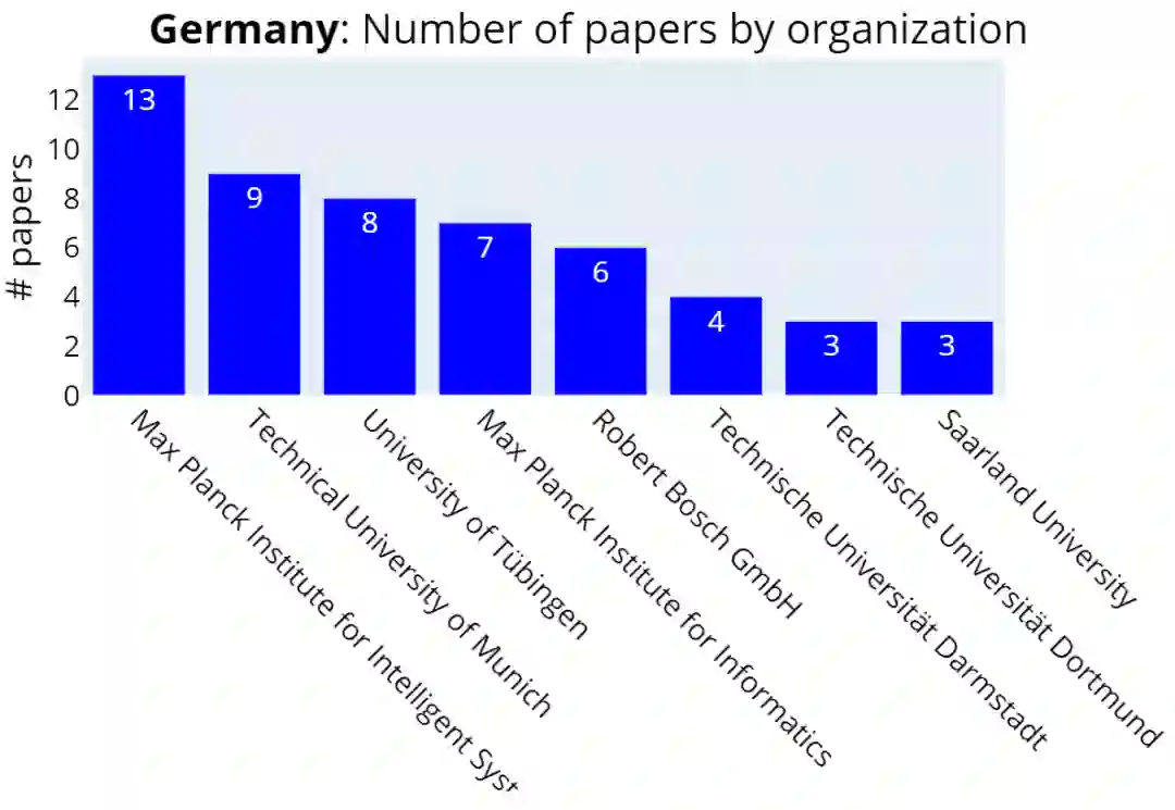 放大特定的国家/地区,我们可以看到机构的排名列表(3篇以上论文),以下列出每个国家发表论文最多的前3~10位。