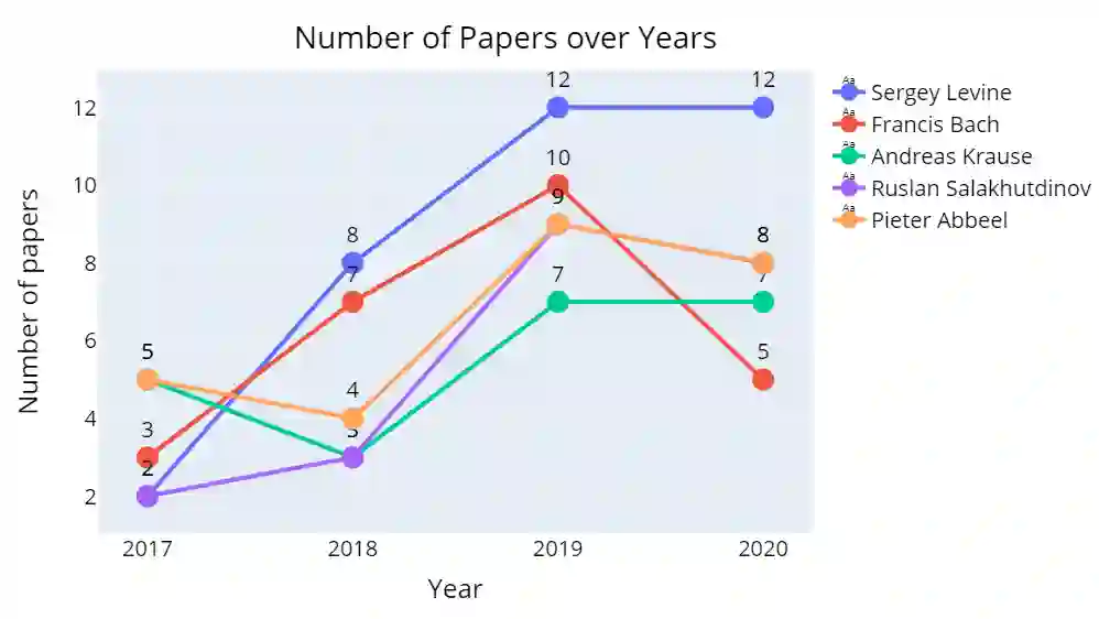 大量接受论文的主要原因是与更多学者合作。例如,Sergey Levine到2020年拥有来自8个分支机构的35位合著者。