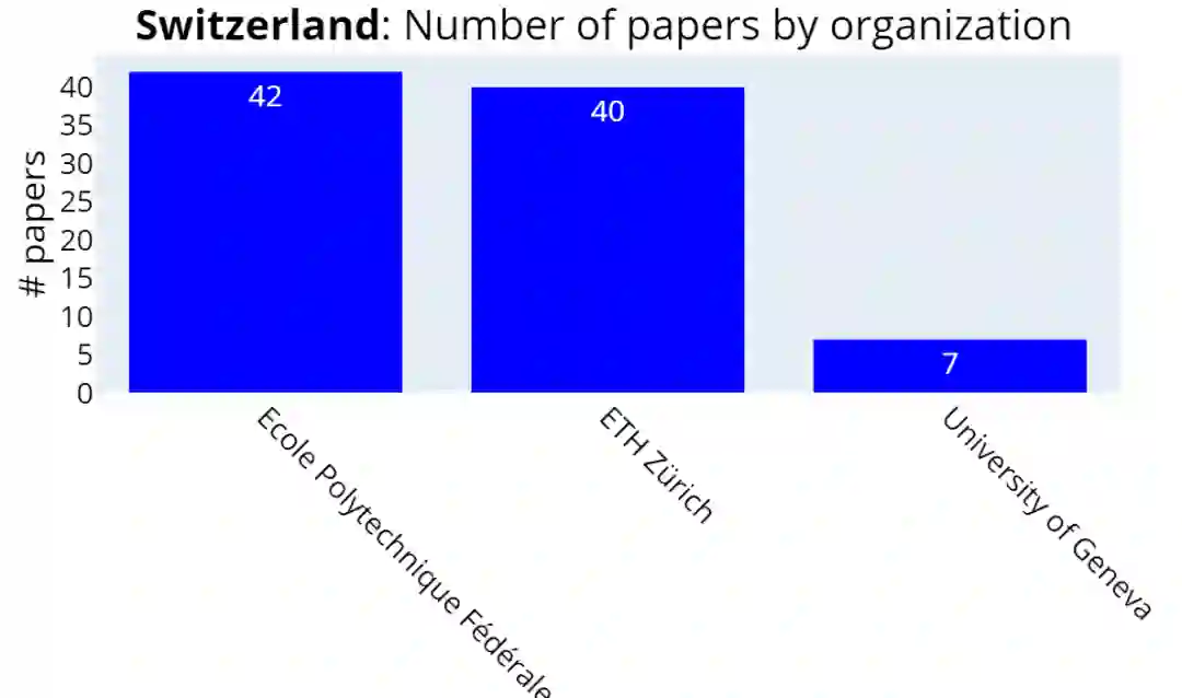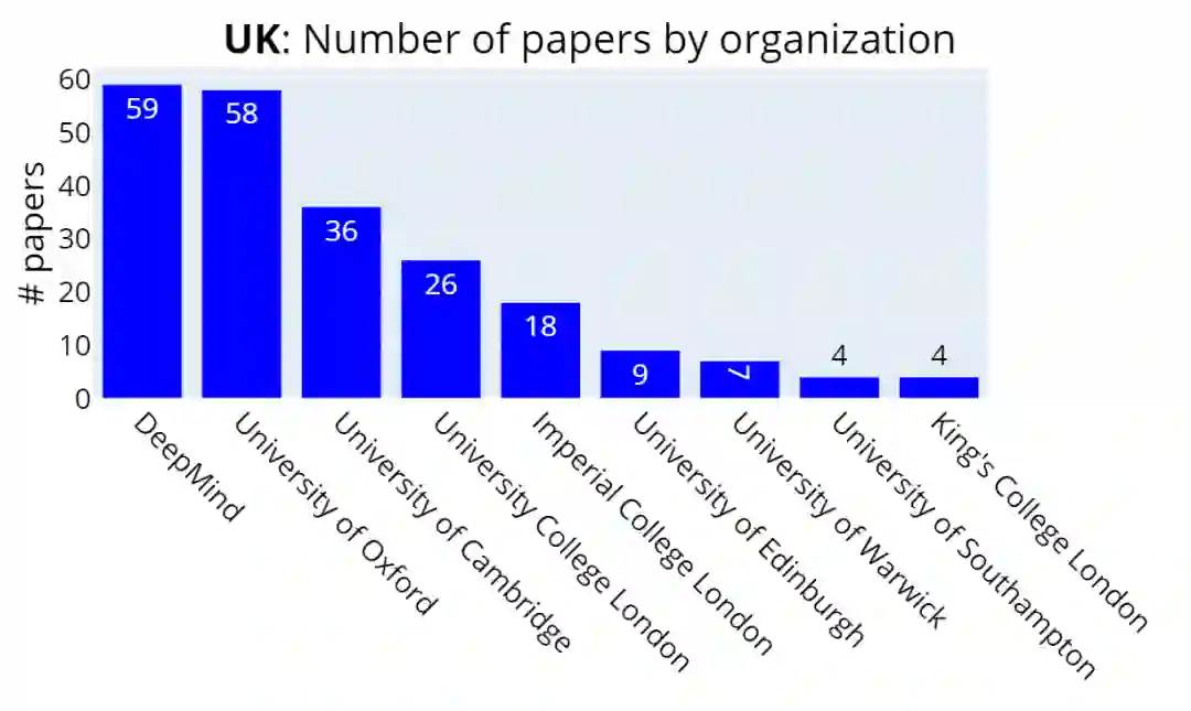毫不奇怪,美国再次登上了榜首,参与了一半以上的论文。中国领先英国,位居第二。