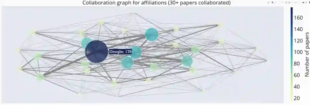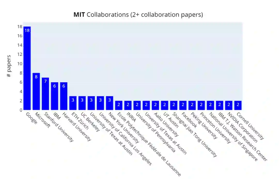 谷歌并未与其他工业公司(DeepMind除外)合作发表论文,而MIT与世界各地的工业界和学术界都有合作。