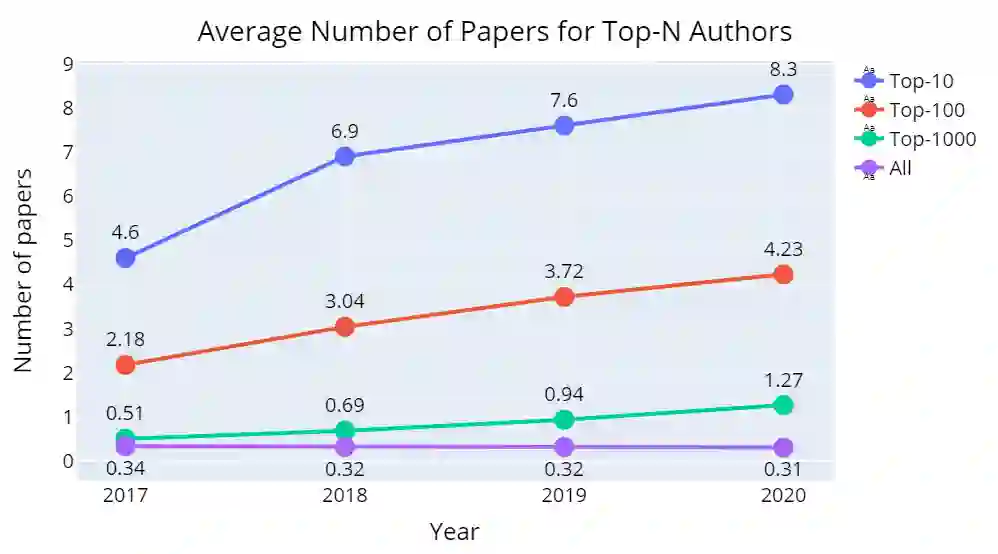 每年排名前10位的作者发表的论文数量在4年中翻了一番,从2017年的平均4.6篇增加到2020年的平均8.3篇。